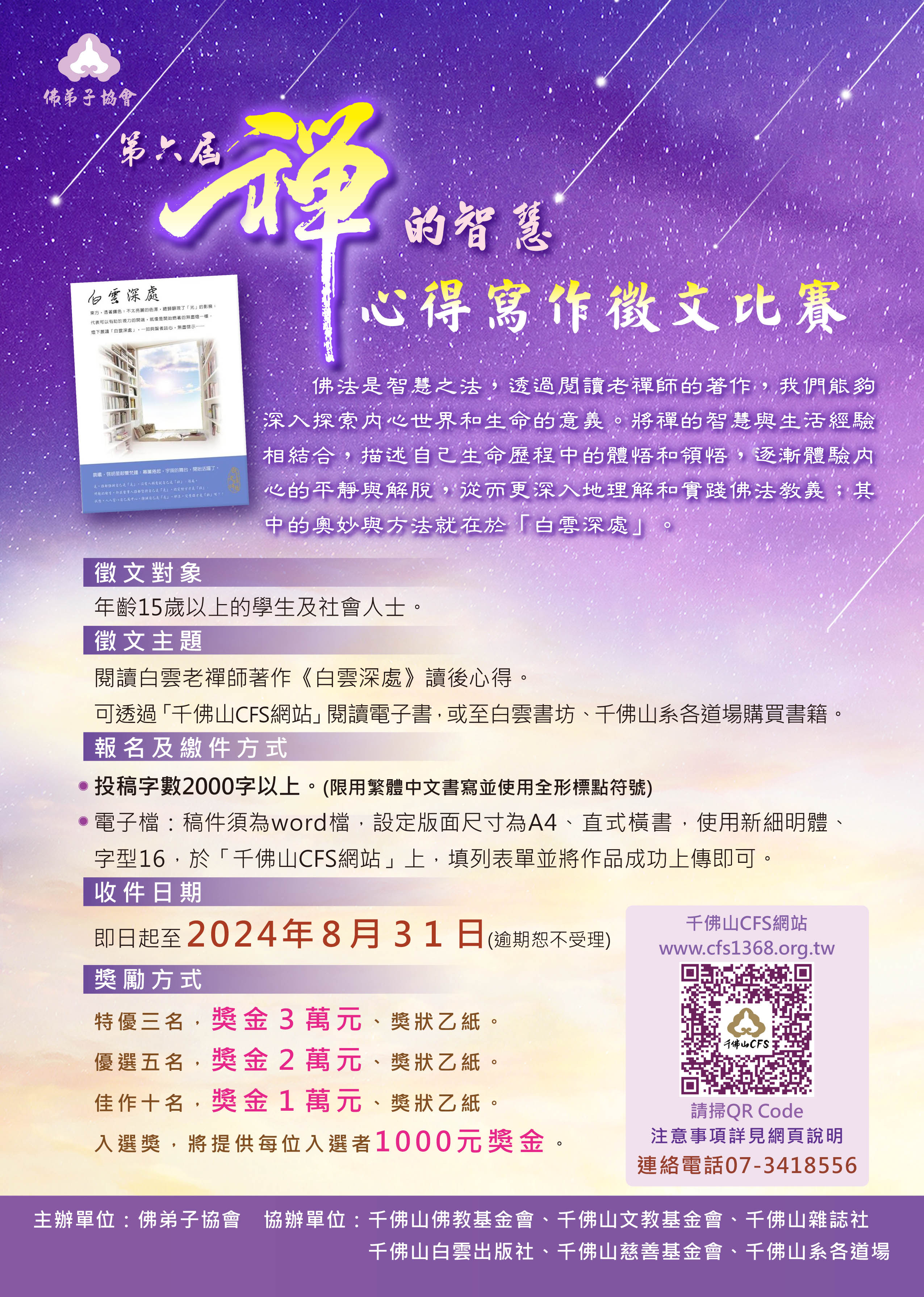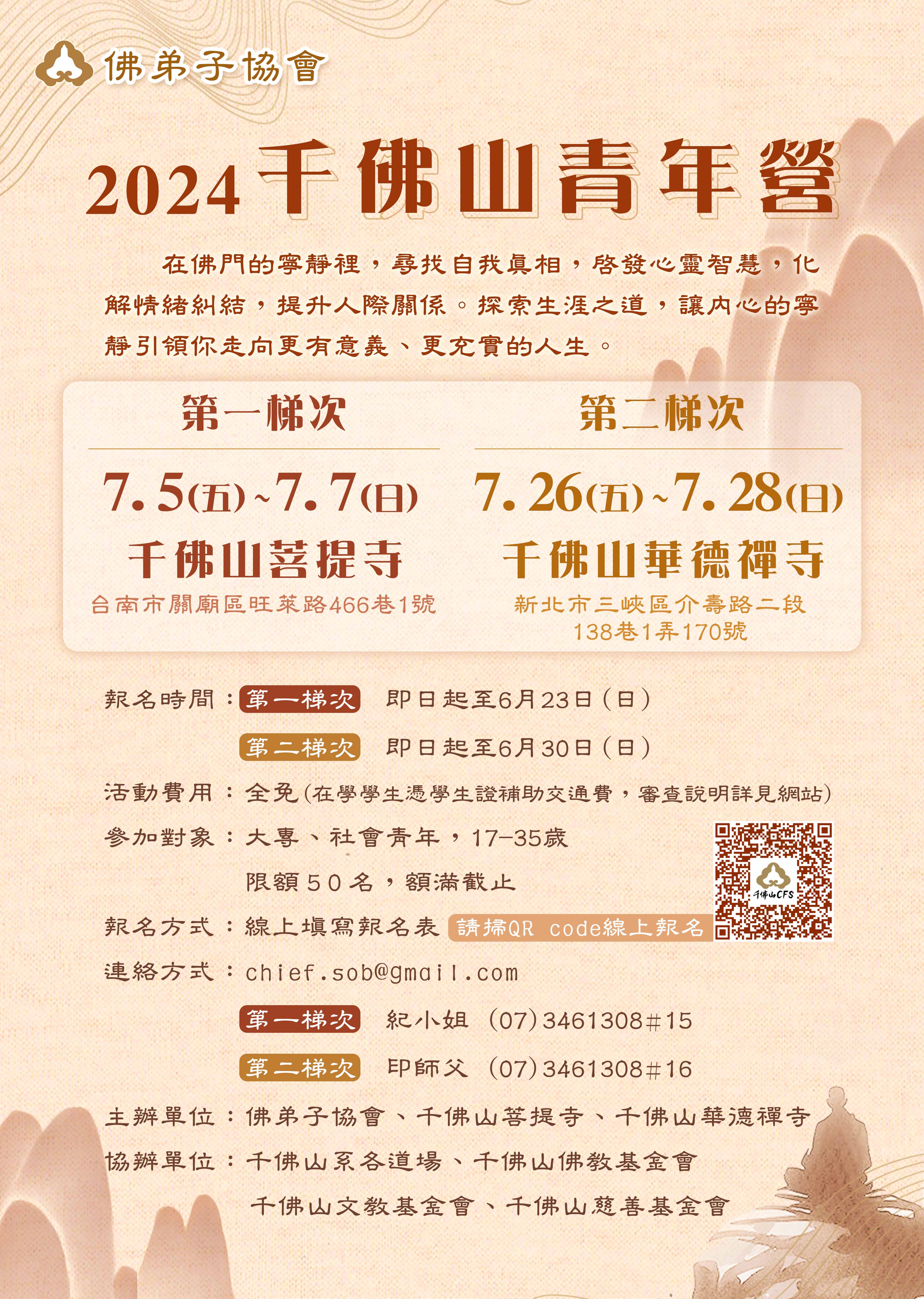 「2024千佛山青年營活動」及「第六屆禪的智慧心得寫作徵文比賽」 2024-06-21• 最新消息 「2024千佛山青年營活動」及「第六屆禪的智慧心得寫作徵文比賽」請參考附件海報 附件下載 第六屆徵文比賽辦法.jpg 2024千佛山青年營.jpg