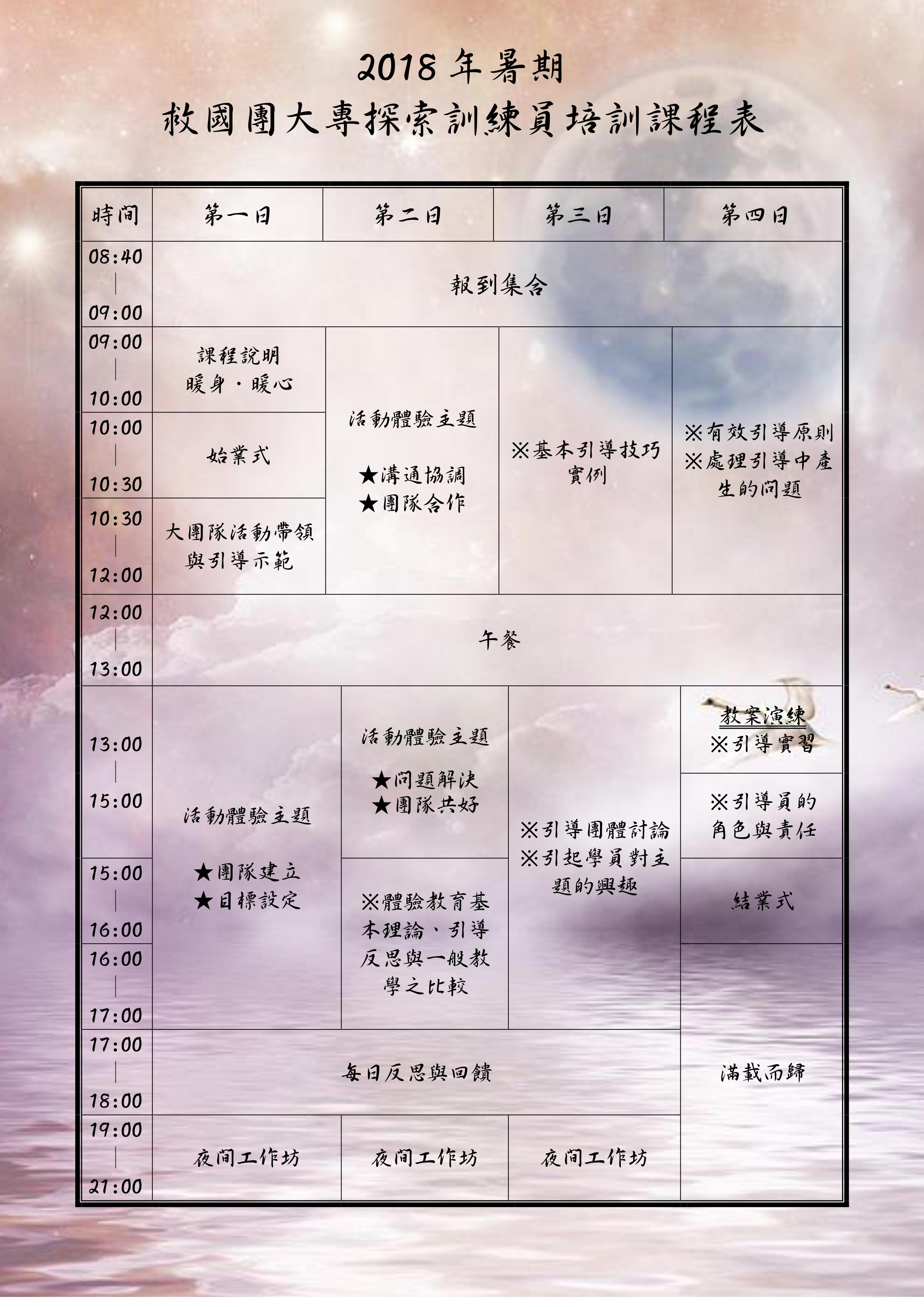 救國團-大專學生探索教育訓練員培訓課程 2018-05-31• 最新消息 詳如附件 附件下載 2018大專探索課程簡介.jpg 2018大專探索-宣傳海報.jpg (學校專用報名表)107年暑期大專學生探索教育訓練員培訓報名表.doc (計畫說明)107年暑期大專學生探索教育訓練員培訓計畫說明書.pdf