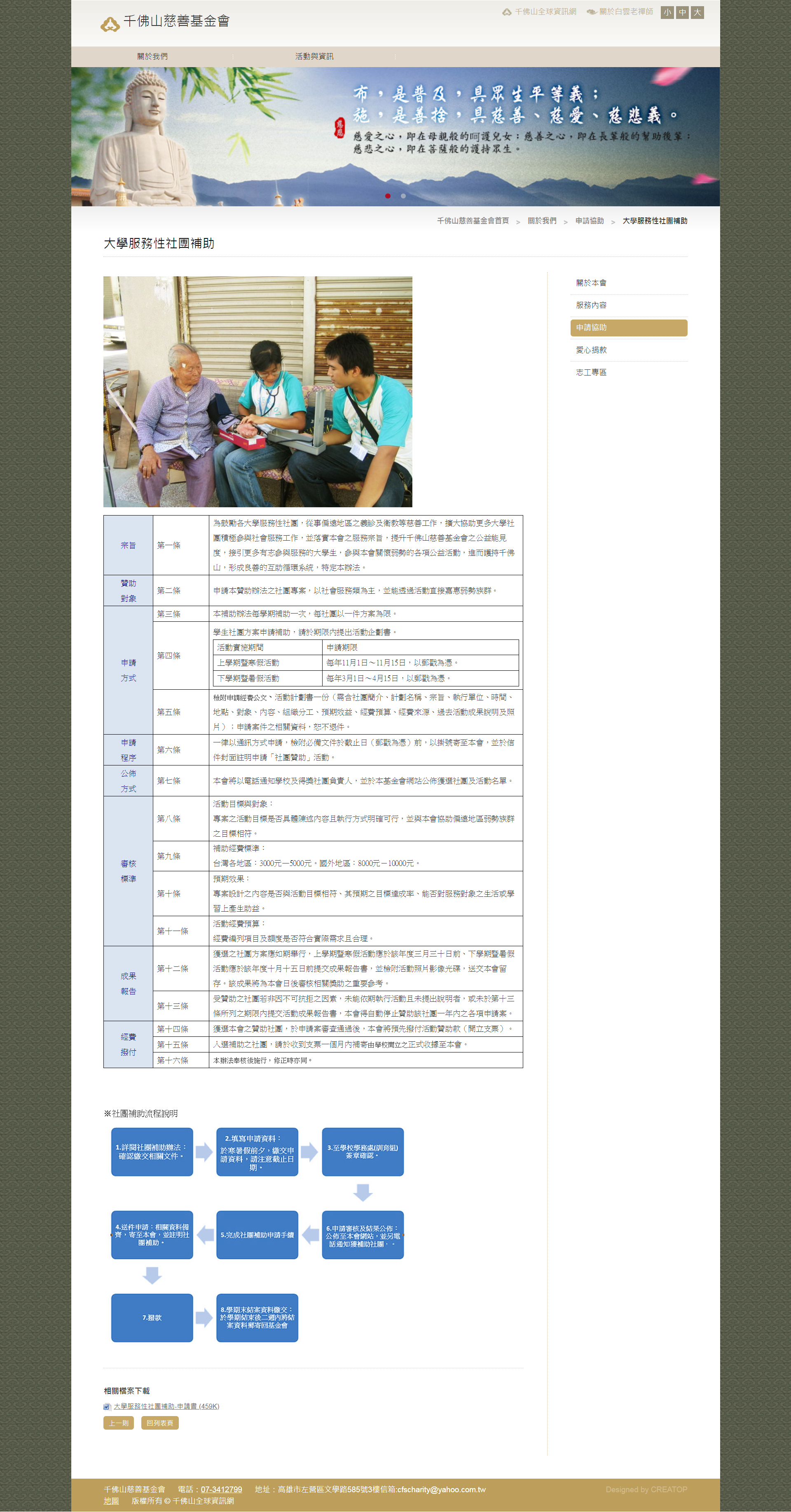 💰【補助申請】108年寒假服務隊─千佛山慈善基金會(11/8截止) 2018-11-01• 最新消息 一、申請資格 1.贊助對象:申請本贊助辦法之社團專案,以社會服務類為主,並能透過活動直接嘉惠弱勢族群。 二、申請資料 1.申請日期:即日起至107年11月8日(星期四)16:30截止。 2.申請文件: (1)活動企劃書:需含社團簡介、計劃名稱、宗旨、執行單位、時間、地點、對象、內容、組織分工、預期效益、經費預算、經費來源、過去活動成果說明及照片)。 (2)附件二申請書 3.繳交方式: (1)將企劃書&附件二申請書:交電子檔給各輔導助教。 (2)信件主旨:某社-108寒隊-千佛山申請書 三、其他 1.請參閱千佛山網站 附件下載 附件二-千佛山申請書.doc 附件一-大學服務性社團活動補助說明.jpg