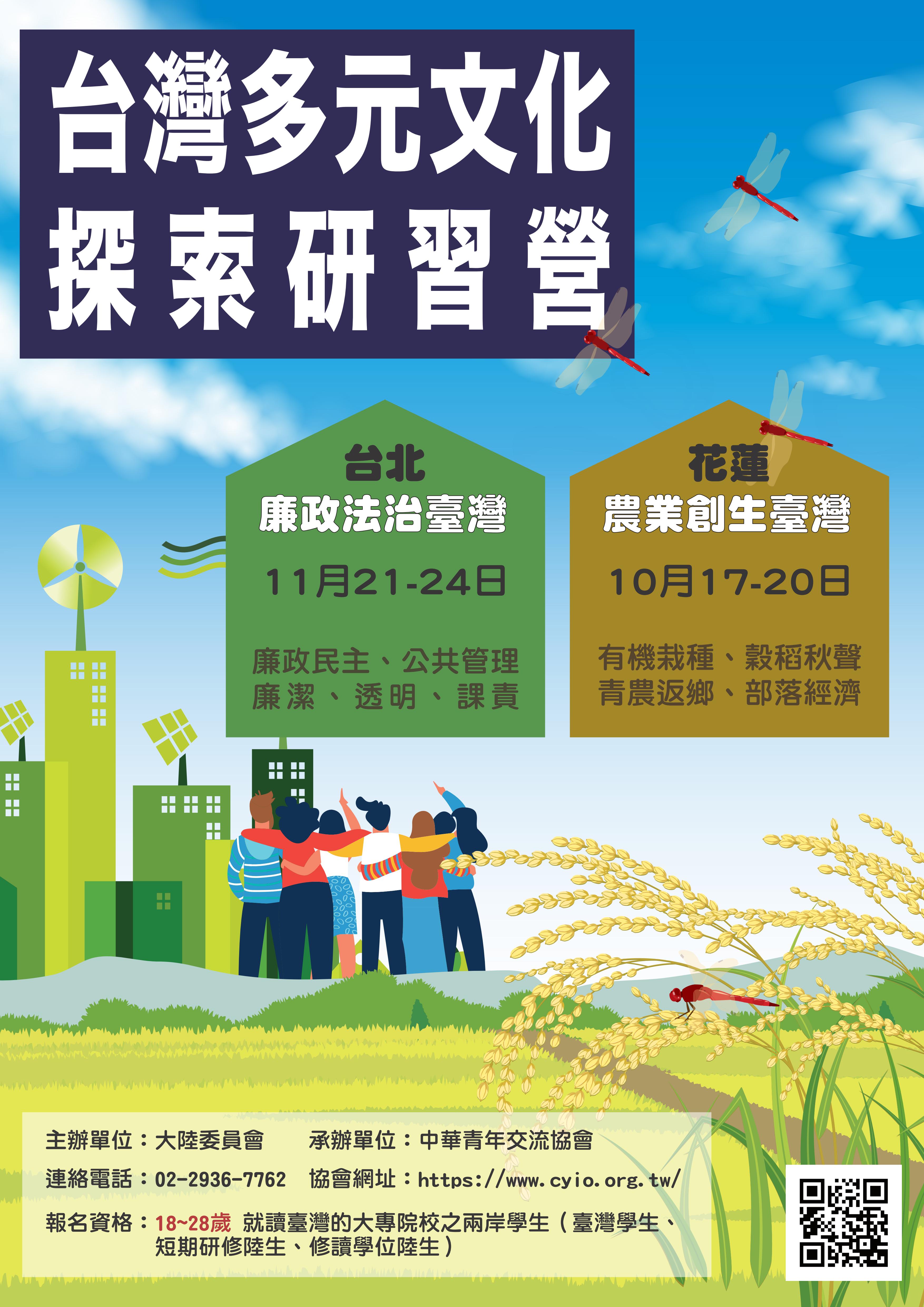 「臺灣多元文化探索研習營」 2019-09-20• 活動訊息 主 旨: 檢送大陸委員會委託中華青年交流協會辦理「臺灣多元文化探索研習營」報名辦法等資訊,請週知鼓勵學生報名,請查照。 說 明: 依據該協會108年9月12日中青流字第1080000062號函辦理。 附件下載 1081281558_3_1080135106_attach3.pdf 1081281558_2_1080135106_attach2.pdf 1081281558_1_1080135106_attach1.jpg