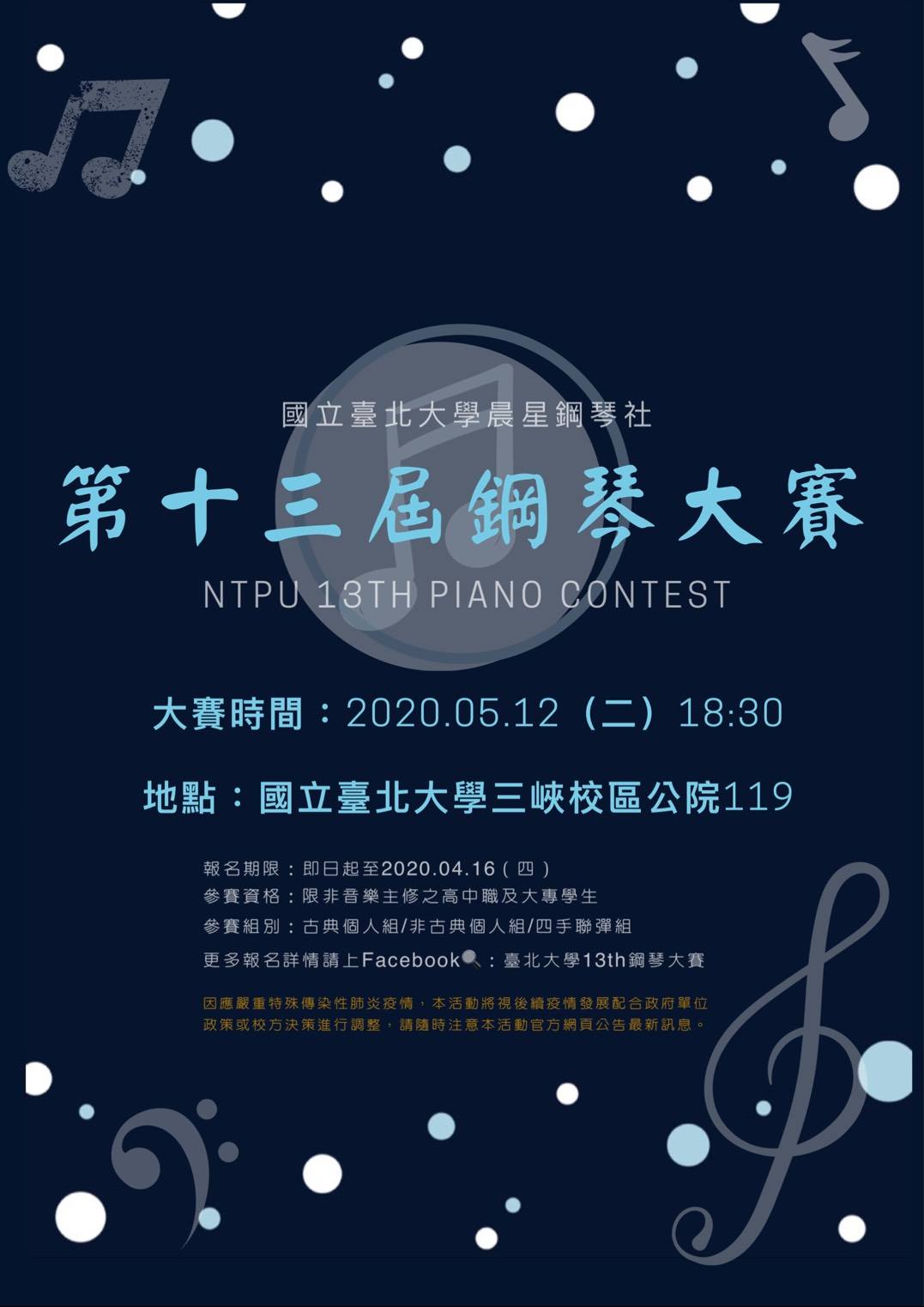 檢送本校學生社團晨星鋼琴社辦理「國立臺北大學第十三屆鋼琴大賽」,敬邀貴校學生踴躍報名參加,請查照。