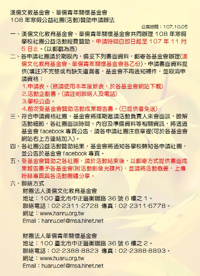 108年寒假辦理公益活動之學校社團,其他相關內容請參考「(附件一)漢、華儒基金會贊助辦法」。
