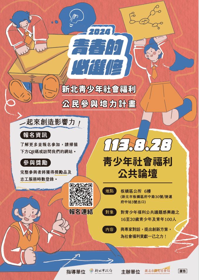 - 隨函檢送本局「青春的必選修-新北青少年社會福利公民參與培力計畫」之青少年社會福利公共論壇宣傳海報1份,敬請轉知並協助宣傳鼓勵學生踴躍參與。